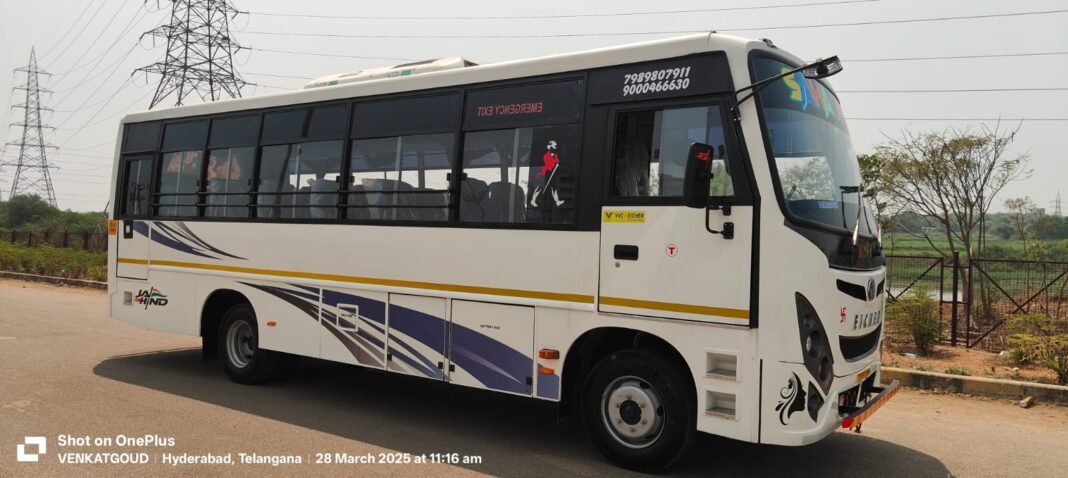 Our 28 Seater Mini Bus in Hyderabad is built for convenience and relaxation. Whether you’re exploring Hyderabad’s top attractions or heading to outstation destinations like Vijayawada, Srisailam, Tirupati, or Araku Valley, our mini bus ensures every passenger travels comfortably.