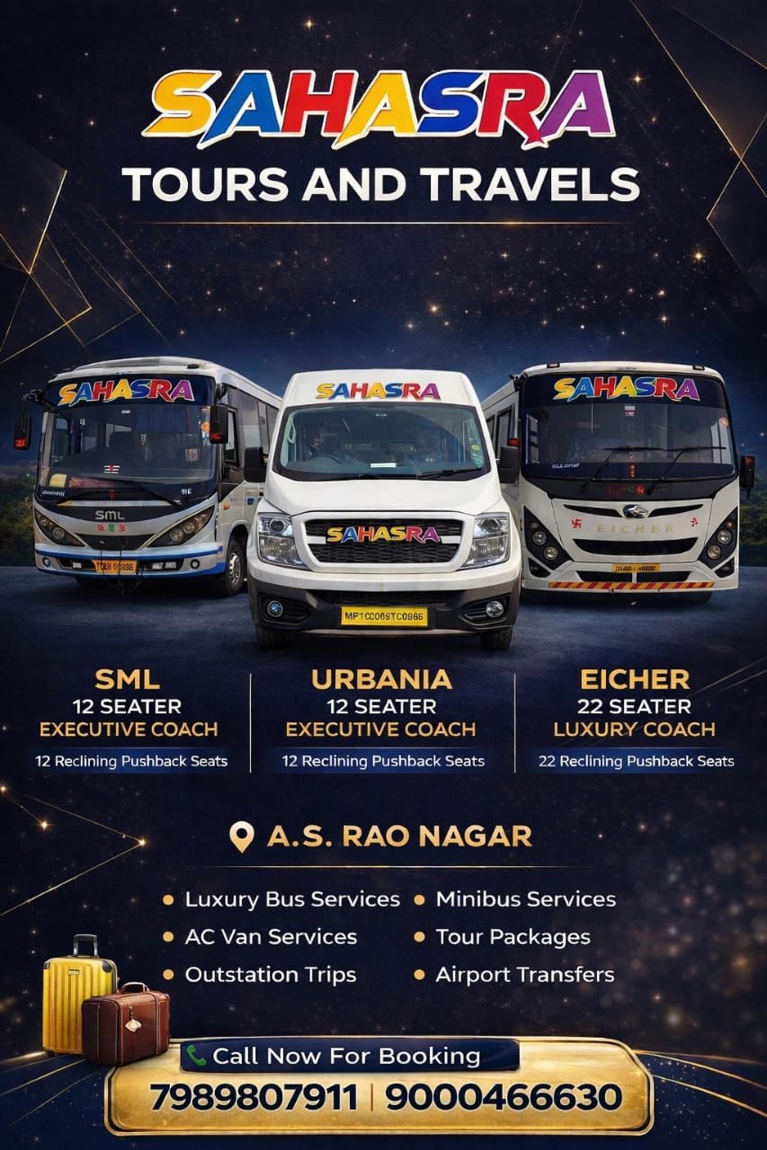Sahasra Tours & Travels is one of the most trusted and premium Tempo Traveller, Mini Bus, and Bus Rental agencies in Hyderabad, dedicated to providing top-quality travel services with comfort, safety, and reliability. We specialize in offering customized travel solutions for individuals, families, corporate groups, schools, and institutions across Telangana and Andhra Pradesh.